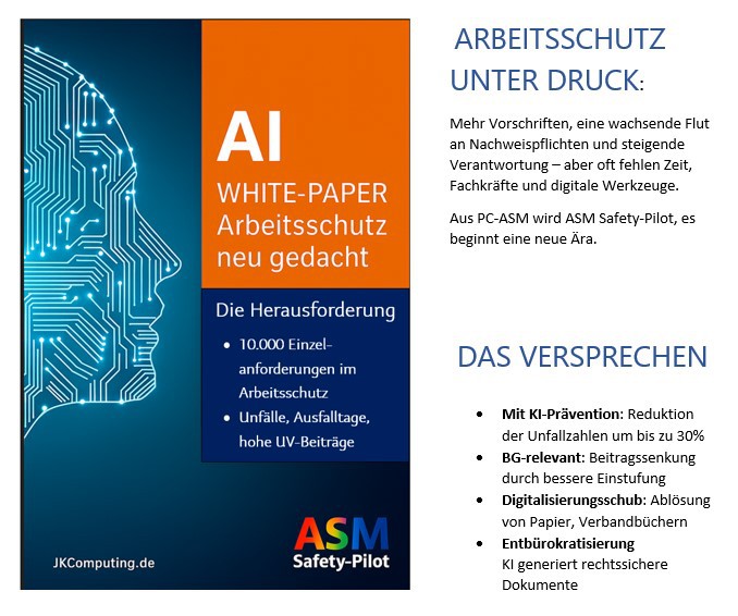 Erfahren Sie, wie direkt aus Ihrer Unfalldatenbank für Verbandbuch-Einträge / Unfallanzeigen der ASM-Safety-Pilot mit API-Schnittstelle zu MS-Copilot die notwendigen Dokumente oder Unfall-Analysen, Arbeitsschutzpläne generiert.