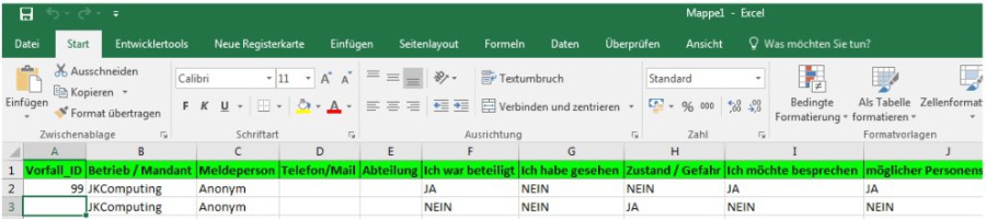 Die Listen enthalten alle Datenfelder der NearMiss-Datenbank. Innerhalb Excel können Sie die umfangreichen Excel-Funktionen für vertiefende Analysen nutzen.