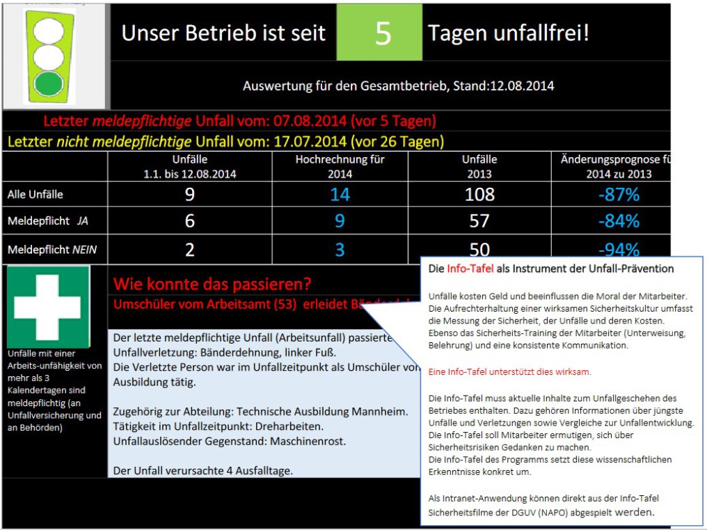 - Seit wie vielen Tagen ist unser Betrieb unfallfrei? → Motiviert durch positive Rückmeldung und fördert