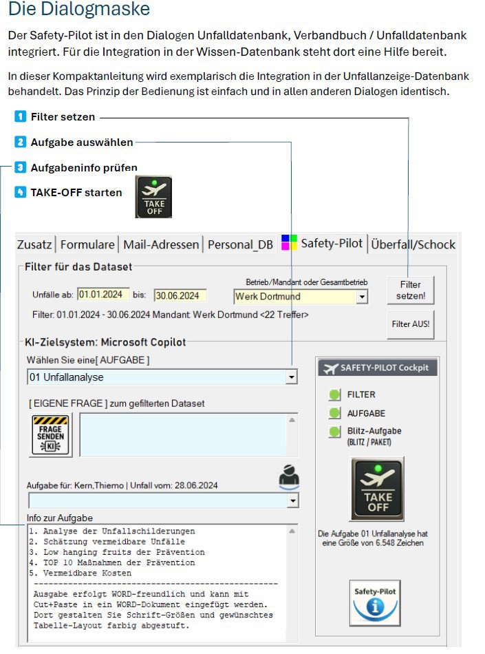 Mit Safety‑Pilot können Sie aus dem digitalen Verbandbuch oder Unfallanzeigen beliebige Datensätze zusammenstellen und direkt KI‑gestützte Analysen starten. Das spart Zeit, schafft Klarheit und liefert sofort nutzbare Materialien für Prävention und Unterweisung.